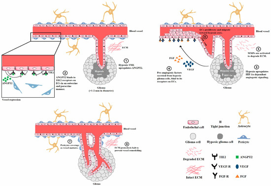 Schematic representation of glioma angiogenesis. As tumor growth within the brain parenchyma goes beyond 1–2 mm in diameter, its metabolic demands cannot be met entirely via diffusion. (1) Hypoxia then occurs to regulate angiogenic signals. (2) The activation of autocrine and paracrine ANGPT2/TIE2 signaling subsequently disrupts endothelial–mural cell interactions for vessel regression. (3,4) HIF-1α upregulation induces the transcriptional activation of proangiogenic molecules that initiate EC proliferation and migration. (5) Simultaneously, increased ANGPT2 activates MMP-2 to degrade the ECM. (6) Proteolysis of the vessel’s basement membrane facilitates the migration and proliferation of ECs toward the hypoxic tumor core. Lastly, the blood vessel wall matures, as (7) pericytes are recruited along the ECs to stabilize the blood vessel. (8) Endogenous protease inhibitors and antiangiogenic factors locally halt ECM proteolysis to hinder further vessel remodeling.