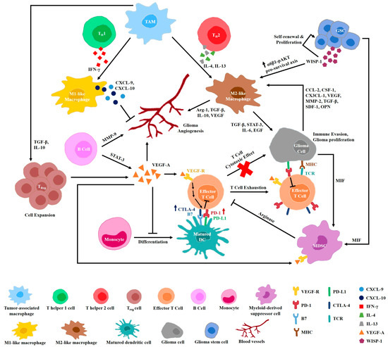 Crosstalk between immune cells and angiogenesis in glioblastoma. Glioma angiogenesis is the result of complex interactions with the immunosuppressive TME that consists of glioma cells, GSCs, and the various immune cells. M1-like and M2-like macrophages are polarized via TH1-derived IFN-γ and TH2-derived IL-4/IL-13, respectively, to mediate angiogenesis. The expansion of Treg releases VEGF-A to sustain tumor vessel growth. B cells modulate angiogenesis directly by producing STAT-3-dependent VEGF-A and MMP-9. VEGF signaling hinders DC maturation and its antigen presentation, suppresses effector T-cell functions via inhibitory immune checkpoint stimulation, and enhances MDSCs immunosuppressive activity, leading to glioma immune evasion. Macrophage migration inhibitory factor (MIF) secreted by GSCs and glioma cells acts on MDSCs-driven T-cell dysfunction. An M2-like TAMs phenotype can be further promoted by GSC-derived WISP-1 via the integrin α6β1/pAKT axis. Crosstalk between glioma cells and M2-like TAMs via various chemokines and cytokines occurs to enhance immune suppression and angiogenesis, as well as tumor cell proliferation.
