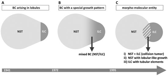 Different concepts of ILC as a special tumor entity and their implications. This is a Venn diagram-like schematic presentation of the relation between BC of NST and ILC, according to different concepts. (A) ILC as BC arising in lobules and terminal ducts (Foote and Stewart in 1941) []. BC of NST and ILC are clearly separated (based on the presence or absence of LCIS). For details, see text Section 2.1. (B) ILC as BC with a special growth pattern (1972 until today, consistent with the 5th edition of the WHO classification of tumors) [,]. The boundary between BC of NST and ILC is less clearly defined compared to concept “A”. BCs with indefinite histomorphology may be classified as mixed BC NST/ILC. For further details, please see text Section 2.2 and Appendix A Table A1. (C) ILC as a morpho-molecular entity (a concept unofficially prevalent in clinical research since the discovery of CDH1 mutations in 1995) []. BC of NST and ILC share a morphologic overlap. Cases in the morphologic overlap may be interpreted as (i) collision tumors, (ii) NST with lobular-like growth pattern but no loss of cell adhesion, and (iii) ILC with tubular elements [,]. For details, see text Section 2.3. An approximate time scale showing the origin of these concepts is given at the bottom.