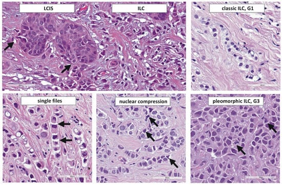 Histomorphology of ILC. From top left to lower right, photomicrographs (×400 magnification) illustrate: transition from LCIS to ILC (arrows indicate LCIS cells that breach through the basal lamina), classical ILC (G1), ILC arranged in single files with gaps between individual cells (arrows), ILC with prominent nuclear compression (arrows), pleomorphic ILC (G3) with brisk mitotic activity (arrows).