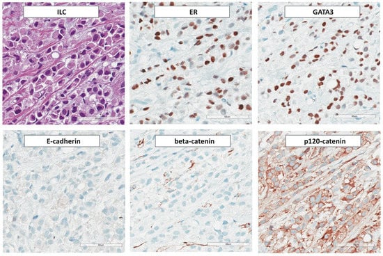 Immunohistochemical features of ILC. From Photomicrographs (×200 magnification) illustrate: expression of ER and GATA3, loss of E-cadherin and β-catenin, and aberrant cytoplasmic localization of p120-catenin.