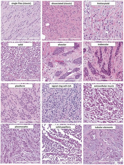ILC variants account for up to 70% of ILC cases (Appendix A, Table A4) [,,,,,,,]. The WHO classification of tumors of the breast (5th edition) mentions four different ILC variants (solid, alveolar, pleomorphic, tubulolobular) as well as histiocytoid differentiation and signet ring cell morphology []. However, more than 10 different histologic variants have been described in the scientific literature (see Section 4.2, Section 4.3, Section 4.4, Section 4.5, Section 4.6, Section 4.7, Section 4.8, Section 4.9, Section 4.10, Section 4.11, Section 4.12 and Section 4.13) (Figure 4). Some variants are named for their growth pattern, such as solid ILC. Other variants are named for cytologic features, such as pleomorphic ILC. Some variants are associated with distinct molecular alterations and slightly different clinical outcome [,,]. The list of ILC variants below is not intended for splitting the diagnosis of ILC into a large number of subcategories, but it gives an overview of previously reported morphological variants. It may help to recognize given tumors as belonging to the lumped category of ILC, of which solid and pleomorphic variants are two distinct non-classical forms covered by the current WHO classification, along with tubulolobular carcinoma, which the authors believe belongs to non-lobular BCs, or to BCs with a heterogenous tumor biology.