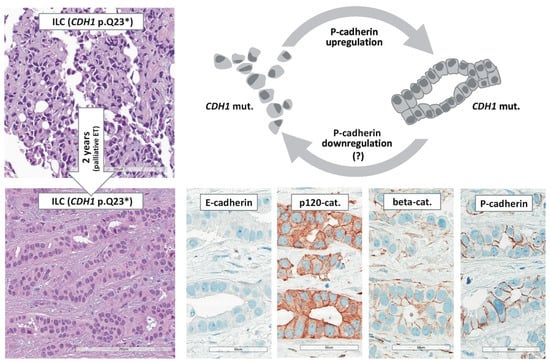 In 1979, Martinez and Azzopardi emphasized that some ILCs display focal tubules []. Meanwhile, so-called tubulolobular BC has been disqualified as an E-cadherin-positive variant of ductal BC (id est, a mimic of ILC) [,,,]. Even so, many pathologists have remained supporters of the idea that focal tubules are compatible with the diagnosis of pure ILC [,,]. A recent study revealed that E-cadherin to P-cadherin switching is the molecular determinant of such tubules in CDH1-deficent ILC (Figure 5) []. P-cadherin is encoded by CDH3. Both genes, CDH1 and CDH3, map to chromosome 16q22.1 (CDH3 is directly upstream of CDH1). CDH1 and CDH3 share 66% homology and nearly identical exon-intron structures [,]. From an evolutionary perspective, CDH3/P-cadherin arose by duplication of CDH1/E-cadherin in the carboniferous, some 300 million years ago []. E-cadherin and P-cadherin and their orthologs exert similar functions in different tissue compartments of various species. In birds, P-cadherin has adopted some of the roles dedicated to E-cadherin in mammals []. Cadherin switching is a physiological process in organ morphogenesis and cell differentiation []. Cadherin switching describes that cells shift to express different cadherins. A classic example is E-cadherin to N-cadherin switching, which regulates primitive streak formation []. In the normal mammary gland, E-cadherin expression is limited to the luminal epithelium, while P-cadherin expression is limited to the myoepithelial cell layer []. P-cadherin expression is common in triple-negative BC (approximately 40–80%), but less common in hormone-receptor-positive BC (approximately 10–23%) [,,,,]. An in vitro cell model based on transient transfection of human BC cell lines indicates that P-cadherin can rescue AJ formation in the absence of E-cadherin []. Aberrant cadherin switching has been described in a variety of tumor entities []. However the relevance of E-cadherin to P-cadherin switching for ILC has just recently been recognized []. E-cadherin-negative ILC cells can activate weak to moderate P-cadherin expression to re-gain focal cell adhesion (Figure 5) []. This results in focal tubular elements in otherwise dyscohesive classic ILC []. Transient E-cadherin to P-cadherin switching may be involved in tumor dormancy in ILC [].