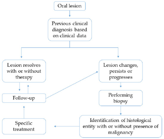 The definition of OPMDs is above all a clinical description, but morphological confirmation is the most important procedure, not only to identify the correct lesion. In the flowchart represented in Figure 1, a previous diagnosis is made based on clinical data of the patient. In cases where the lesions persist, change or progress, biopsy is mandatory, and histological examination represents the most complete and useful tool to exclude or confirm the presence of dysplasia in order to assess the risk of malignant transformation.