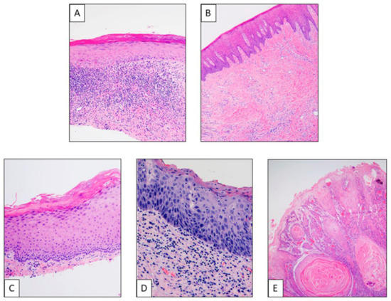 Different histological entities of oral lesions. (A) Lichen planus: Histologically characterized by degeneration of the basal cell line of the epithelium oral mucosa, with presence of diverse degrees of orthokeratosis and parakeratosis besides thickness of spinous layer and a characteristic band-like lymphocytic infiltration at the basal level and superficial submucosa. (B) Oral submucous fibrosis: This is a chronic progressive scarring lesion, morphologically showing evident submucosal changes such as fibrosis, diffuse chronic inflammatory infiltrate, atrophy of minor salivary glands, skeletal muscle atrophy, band-like infiltrate, edema and congestion, and vesicle formation. At mucosa level, we found changes such as atrophic changes, pigment incontinence, ulceration with granulation tissue, hyperplastic changes, dysplasia or malignant transformation. (C) Low-grade dysplasia. (D) High-grade dysplasia/in situ carcinoma: Dysplasia is a premalignant condition that refers to abnormal epithelial growth characterized by architectural and cytologic atypia, including dyskeratosis, basal cell hyperplasia and anaplasia, keratin pearls, etc. Low-grade refers to architectural and cytologic atypia affect from 1/3 to 2/3 of epithelium; high-grade/in situ carcinoma represents full thickness cytological or architectural atypia, without invasion of the neoplastic keratinocytes through the basement membrane. (E) Infiltrating squamous cell carcinoma: Malignant neoplasm characterized by severe dysplasia of the surface epithelium with invasion of the stromal–epithelial interface.