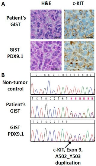 - Van Looy, T.; Gebreyohannes, Y.K.; Wozniak, A.; Cornillie, J.; Wellens, J.; Li, H.; Vanleeuw, U.; Floris, G.; Debiec-Rychter, M.; Sciot, R.; et al. Characterization and assessment of the sensitivity and resistance of a newly established human gastrointestinal stromal tumour xenograft model to treatment with tyrosine kinase inhibitors. Clin. Sarcoma. Res. 2014, 4, 10. [Google Scholar] [CrossRef]