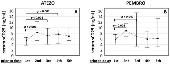 Changes in serum sC25 during the first four cycles of immunotherapy with anti-PD-1/PD-L1 drugs. Figure presents medians (filled squares) and interquartile ranges (whiskers) of sCD25 protein in subjects with NSCLC receiving (A) ATEZO and (B) PEMBRO.