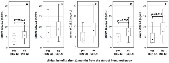 Serum sCD25 levels stratified by achieving long-term benefits from treatment. Figure presents medians (filled squares), interquartile ranges (boxes), and ranges excluding outliers for sCD25 protein measured at (A) baseline and at the end of (B) cycle 1, (C) cycle 2, (D) cycle 3, and (E) cycle 4 in patients who obtained (BEN-12) and lacked (NB-12) clinical benefits after 12 months from the start of immunotherapy.