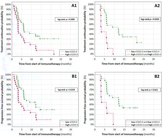 Figure 3A2,B2 present the differences in TTF and PFS after stratifying patients by high and low levels of both sCD25.0 and sCD25.4. None of the patients with high sCD25.0 and sCD25.4 continued the therapy longer than 9.3 months; almost 40% of patients with low sCD25.0 and sCD25.4 were treated for at least 12.3 months (Figure 3A2).