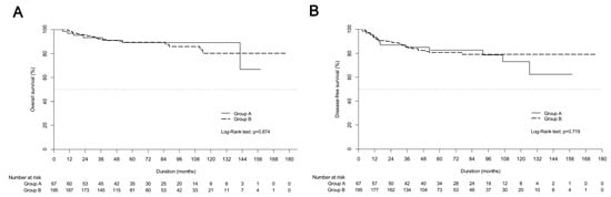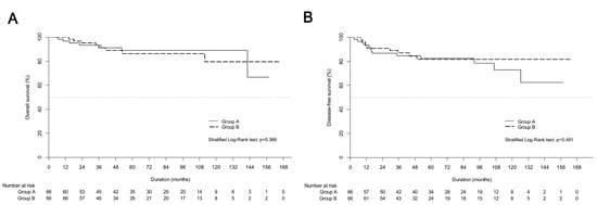 At the time of analysis, 29 patients had died, and 233 patients were alive. The median follow-up was 62.2 months and 54.9 months for group A and group B, respectively. The 5-year OS rates were 89.0% for group A and 89.2% for group B (Figure 1A). The 5-year DFS rates were 82.7% and 80.6% for group A and group B, respectively (Figure 1B).