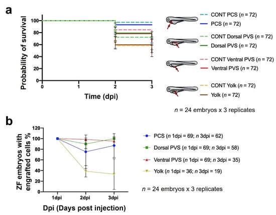 Impacts of different sites of cell implantation on embryo survival (a) and the percentage of zebrafish embryos containing engrafted 888mel mCherry cells. (b) Controls (CONT) refer to embryos microinjected with only the vehicle in which cells were diluted for microinjection (PBS + 2% PVP 60). The data are represented by Kaplan–Meier survival curves, and the results of statistical analyses for (a) are detailed in Table S5. Only zebrafish exhibiting a higher TA at 1 dpi than a pre-defined threshold were included in the analysis. Embryos were considered to present engrafted cells when the TA at 3 dpi was ≥ than the TA at 1 dpi. Results of the statistical analyses for (b) are shown in Tables S6.