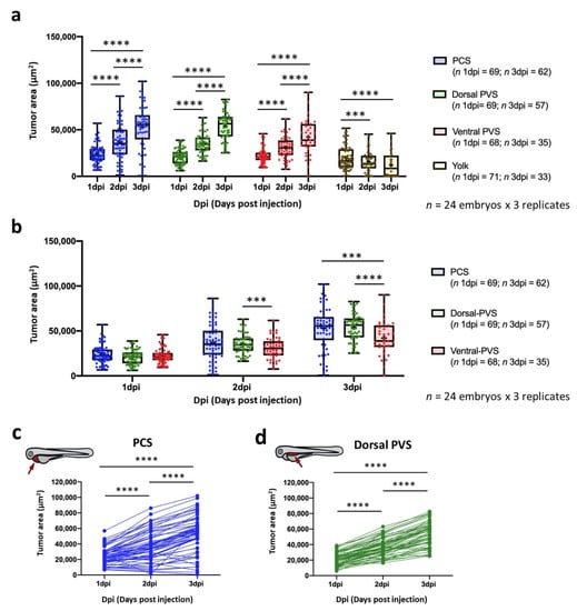 Impact of site of cell implantation on tumor area ascertained by imaging. (a) Comparison of the tumor areas of engrafted embryos at three time points grouped by the sites of injection. (b) Comparison of the tumor areas of engrafted embryos microinjected into different injection sites grouped by time points. Data are presented as box-leaf plots, where the box indicates IQR, line the median value and leafs the 5–95 percentile range. (c) Change in tumor area tracked for individual embryos implanted into the PCS and dorsal PVS. Only zebrafish possessing a tumor area higher than a pre-defined threshold were considered for the analysis (Table S2). Each dot represents an individual embryo. The experiment was designed as a balanced incomplete block assay. Mixed factorial ANOVA was performed with the anovalator STATA command (*** = p-value < 0.001; **** = p-value < 0.0001).