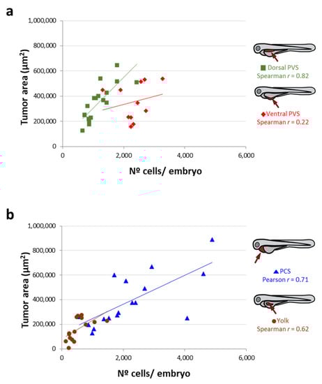 Correlation between the tumor area measured by imaging and the n° of cells/embryo quantified by qPCR (after an inverse interpolation using standard curves) according to each site of injection. (a) Correlation between the tumor area (from the 10 embryos that constitute a pool) and the n° of cells determined using gDNA (human Alu sequences) as the PCR template for 888mel mcherry cells implanted into the dorsal or ventral PVS. (b) As for (a) but cells implanted into the PCS or yolk sac.