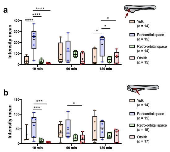 Alexa FluorTM 488 dextran 10,000 MW (Thermo Fisher Scientific, Waltham, MA, USA) was used for distribution evaluation. A stock solution (10 mg/mL) was prepared according to the manufacturer´s instructions, and borosilicate glass capillaries were then calibrated for microinjection of 4 nL. To assess toxicity and compound leakage, we performed an initial experiment in which the embryos were microinjected into the dorsal PVS, PCS, yolk sac, hindbrain, retro-orbital space and otic vesicle. In the first experiment, images were acquired at different time points using Cytation 5 image reader, and the embryos were kept until 1 dpi. The dorsal PVS and hindbrain locations were discarded, and the experiment was performed once again. Then, the microinjected embryos were fixed with 4% paraformaldehyde at 10-min post-injection (mpi), 60 mpi and 120 mpi. Confocal image acquisition was carried out using Opera imaging device (Perkin Elmer) at the Spanish National Cardiovascular Research Centre (CNIC). Finally, analysis was performed with Fiji software [22]. A macroscript was developed by image analysts to manually draw the areas of interest around the dorsal PVS and PCS. Metrics obtained from image acquisition were: Area = number of pixels from the region of interest; Mean = mean intensity in the region of interest (total accumulation corrected with the number of pixels), Int Den = intensity accumulation in the region of interest. Dextran was quantified as the Mean to correct the fluorescence intensity within the delimited area and reduce the influence of the embryo orientation. Each image was manually segmented 6 independent times, 3 from the same confocal sections and 3 others by independently selecting three other confocal sections. Furthermore, embryo autofluorescence was normalized to that in the control group (non-microinjected embryos) by Z-score correction. The Z-score corrections with values from the negative control group (non-microinjected embryos) were determined as follows (3); where x is measurement, µneg ctrl is the negative control measurement and σneg ctrl, the standard deviation of the negative control: