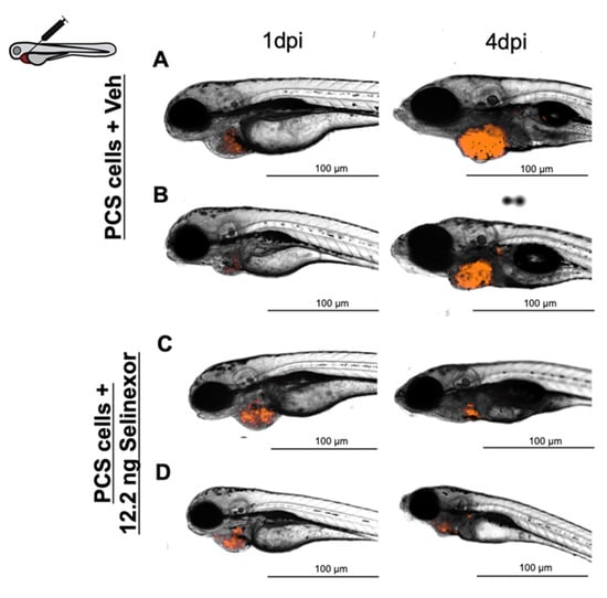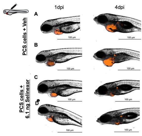 We aimed to perform in vivo efficacy assays using zebrafish embryo xenografts (Figure S1). After cancer cell xenotransplantation, sorting and imaging, engrafted zebrafish embryos were treated with different concentrations of selinexor administered via immersion or direct intratumoral microinjection. Drug at varying concentrations was prepared for injection with different percentages of DMSO, saline solution and 10% Tween 20 (Sigma Aldrich, San Luis, MO, USA) to enable drug solubility. To calculate the drug concentrations, the total volume of zebrafish embryos at 3 dpf (270 nL) was employed [24]. In total, 24 embryos were employed in each experimental group, with each experiment having 3 controls. One control group without implanted cells was used to control the viability of the clutch, while another control group of embryos with xenografted cancer cells implanted in the PCS but without treatment was used to evaluate the transplantation technique and a control group of xenografted embryos with cancer cells implanted into the PCS and treated with the drug vehicle were utilized. Prior to drug microinjection, borosilicate glass capillaries were calibrated as above. Zebrafish embryos were anesthetized with tricaine and placed into agar plates, wherein the drug was administered by intratumoral microinjection into the PCS. Later, the zebrafish embryos were kept in recovery medium for 1 h before being placed individually in 96-well plates in 200 μL of E3 medium at 34 °C in the dark and incubated in a humid environment for 24 h. This drug administration process was carried out for 2 consecutive days until 3 dpi or for 3 consecutive days until 4 dpi. On the final day of the experiment, images were acquired again as previously described. To treat the xenografted embryos with drugs by immersion, sorting and imaging were performed at 1 dpi, and the zebrafish xenografted embryos were placed individually into 96-well plates containing 200 μL of E3 medium supplemented with the dissolved drug. The medium was removed every 24 h and replaced with fresh E3 medium containing the drug or vehicle until the final day of the experiment.