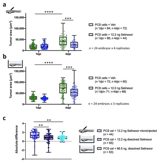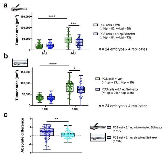 We tried to increase the DTG between the experimental groups (tumor growth window) to increase the sensitivity window and thereby yield accurate conclusions. Hence, selinexor was microinjected on three consecutive days, extending the assay to 4 dpi (Figure 6). DTG percentage between both experimental groups was higher than initial results, 77.11%. versus 63.7% (4 dpi and 3 dpi respectively) Furthermore, larger differences at 4 dpi were detected in the TA after treatment extension (p-value = 0.0001 versus p-value = 0.0206 at 3 dpi) (Figure 7a). We used 24 embryos per experimental group in the efficacy assays and we performed at least 3 independent replicates. However, to evaluate the minimum number of replicates required, we performed a statistical analysis: 24 embryos per 2 replicates versus 24 embryos per 3 replicates (Tables S3 and S4). These results showed that 6.1 ng Selinexor (lowest concentration tested) by intra-tumoral microinjection until 3 dpi, required at least 3 replicates to detect significant differences. However, extending the drug administration until 4 dpi 2 replicates was enough to observe it. Then, tumor engraftment was assessed after dissolving the same amount of selinexor into the fish water. Although the TA measured at 4 dpi in drug-treated embryos was lower than that in vehicle-treated embryos (p-value = 0.0217), the DTG was lower (12.3%) between these experimental groups (Figure 7b). However, the efficacy was inferior to that obtained after drug microinjection. Vehicle-treated embryos by microinjection showed an RTG of 177.47% (SD = 138.08%) and 142.89% (SD = 72.56%) by immersion, showing tumor engraftment. To compare both administration approaches, the absolute differences in efficacy were calculated. Considering 0 to indicate no drug efficacy (Materials and Methods), we obtained absolute differences in efficacy of 0.70 and 0.29 after microinjection and immersion, respectively (Figure 7c).