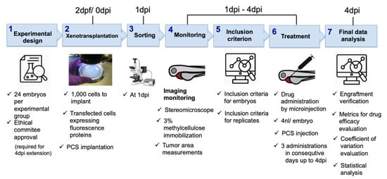 In summary, the use of the zebrafish xenotransplantation model for drug discovery is a complex multifactorial process. Currently, a wide range of approaches is taken, revealing the lack of an experimental consensus in the scientific literature. Herein, we explored the main steps of this procedure to set standard guidelines, which rely on metrics-based assessments, and support reliable screening campaigns. The steps explored using a melanoma cell line were as follows: (1) cancer cell implantation into different sites (pericardial space (PCS), dorsal PVS, ventral PVS and yolk) to identify the best site for tumor engraftment and growth enhancement; (2) establishment of user-independent inclusion criteria to ensure sample homogeneity; (3) determination of tumor engraftment using imaging as a monitoring technique; (4) imaging and qPCR comparisons to identify the most appropriate quantification approach; (5) gDNA and RNA assessment to identify the most suitable material for qPCR; (6) injection site evaluation for compound administration; and (7) comparison of compound administration routes (immersion and intratumoral injection) in efficacy assays using selinexor as an example.