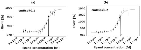 The KD values of the cmHsp70.1 and cmHsp70.2 mAbs to recombinant Hsp70 protein, as determined by Microscale Thermophoresis (MST) measurements, were 0.42 nM and 0.44 nM, respectively (Figure 1a,b).