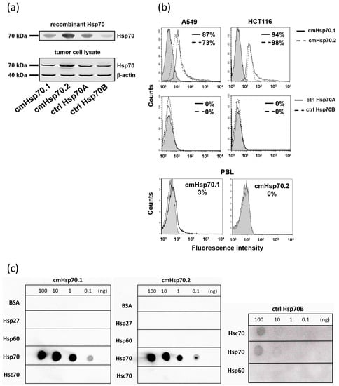 Western blot of recombinant Hsp70 protein and tumor cell lysates, flow cytometric analysis of membrane-bound Hsp70 on viable tumor cells, and dot blot analysis using BSA, recombinant Hsp27, Hsp60, Hsp70, Hsc70 as target proteins. (a) Hsp70 protein and lysates of tumor cells were subjected to an SDS gel and blots were stained with cmHsp70.1, cmHsp70.2, ctrl Hsp70A and ctrl Hsp70B antibodies. Representative immunoblots of recombinant Hsp70 (upper, 72 kDa) and tumor cell lysates (lower) representing Hsp70 (72 kDa), Hsc70 (73 kDa) and β-actin (40 kDa) as a loading control are shown. Molecular weight markers are indicating 70 kDa and 40 kDa. Detailed information about Western blot can be found at Supplementary Materials. (b) Detection of membrane-bound Hsp70 on A549, HCT116 cell lines by flow cytometry using the cmHsp70.1, cmHsp70.2, ctrl Hsp70A and ctrl Hsp70B antibodies (white histograms). Staining with the respective isotype-matched control antibodies is represented by grey histograms. As a control, PBL of healthy donors were stained with cmHsp70.1 and cmHsp70.2 mAb. The numbers in the histograms indicate the proportion of Hsp70 positively stained cells. (c) Dot blot analysis of BSA, recombinant Hsp27, Hsp60, Hsp70 and Hsc70 (100 ng, 10 ng, 1 ng, 0.1 ng) using cmHsp70.1, cmHsp70.2 and ctrl Hsp70B antibodies.