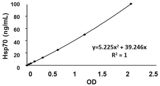 Representative eight-point calibration curve for measuring samples of healthy individuals. The X-axis and Y-axis represent the OD (a.u.) and the Hsp70 protein concentration (ng/mL), respectively.