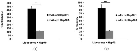Detection and recovery of liposomal Hsp70 in serum. Quantification (a) and recovery (b) of lipid-bound Hsp70 in artificial lipid vesicles (liposomal Hsp70: 500 ng/mL), as determined by the sandwich Hsp70 ELISA using the cmHsp70.2 mAb as a coating antibody, and cmHsp70.1 and ctrl Hsp70A mAbs as detection antibodies. The data represent mean values of three independent experiments, *** p < 0.001, a two-sided t-test was used.