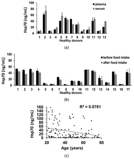 To investigate the robustness of the data obtained with the compHsp70 ELISA using cmHsp70.2 mAb for coating and cmHsp70.1 mAb for detecting, serum and plasma samples from 13 healthy volunteers were collected. As shown in Figure 5a, Hsp70 concentrations measured in the plasma and serum by the compHsp70 ELISA were not significantly different. These data indicate that the compHsp70 ELISA can measure free and vesicular Hsp70 in both plasma and serum samples. To determine the influence of food intake on the detection of Hsp70 in the blood, serum samples were taken from 17 healthy individuals before and 2 h after an intake of a high fat diet. In all cases, serum Hsp70 concentrations before and after food intake were the same (Figure 5b). Since the age of the donors might have an impact on the Hsp70 concentrations in the circulation, plasma samples of 108 volunteers in different age groups ranging from 21–77 years (Table 3) were analyzed. As shown in Figure 5c, there was no significant correlation between plasma Hsp70 concentrations and the age of the donors, as determined using the Pearson correlation test (R2 = 0.0781).