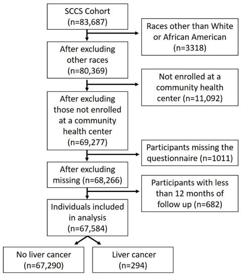 State Cancer Registries and the National Death Index (NDI) were the primary means of ascertainment of incident HCC diagnoses [16]. SCCS data can be linked with the 12 state cancer registries from which the participants were recruited. It is possible that participants can move out of those twelve states, so we also connected with NDI to identify those additional cases. Liver cancers were identified using the International Classification of Diseases (ICD) 10 code of C22.0 for hepatocellular carcinoma. The participants without HCC were linked to the Social Security Administration (SSA) for determination of current vital status. Cohort member information for those known through SSA to have died (or whose current status is unknown to SSA) was sent to the NDI to ascertain cause (or fact and cause) of death [17]. Cohort data were updated until 31 December 2017.