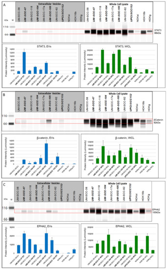 βCatenin (βCat) (Figure 6B) was detected at 92 kDa in all of the whole cell lysate samples tested. In the EVs, the only appreciable βCatenin signals were seen in the EVs from HPV-positive HNSCC lines UM-SCC-47, UM-SCC-105, and UPCI:SCC152, and those from the HPV-negative HNSCC line UM-SCC-17A.