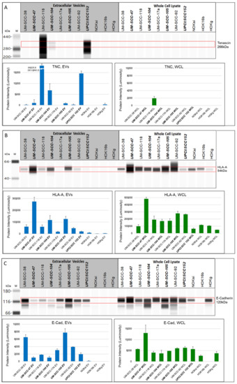 Wes protein gel and quantitative luminosity for extracellular vesicles and whole cell lysates from HNSCC, normal keratinocyte, and transformed cell lines. (A) Tenascin detected at 266 kDa, 1:200 antibody dilution, 0.5 μg/μL protein; (B) HLA-A detected at 54 kDa, 1:400 antibody dilution, 0.25μg/μL protein; (C) E-cadherin detected at 120 kDa, 1:250 antibody dilution, 0.5μg/μL protein; (D) EGFR detected at 180 kDa, 1:100 antibody dilution, 0.25 μg/μL protein; and (E) CK19 detected at 45 kDa, 1:100 antibody dilution, 0.25 mg/mL protein. Bold italics: HPV-positive.