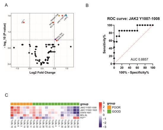 JAK1/2-STAT6 pathway in T-LBL pediatric patients. (A) Volcano plot of all proteins evaluated by RPPA. Log2 Fold Change, given for each protein, is computed as the difference in the means of log base 2 between good vs. poor prognosis. A Log2 Fold Change equal to 0 indicates no difference, higher than 0 indicates that the mean in patients with good prognosis is higher than the mean for poor prognosis. Statistical significance for each protein is reported in the vertical axes (as -log base 10 of the q-values). Q-values ≤ 0.1 are equivalent to points above (or on) the horizontal dashed line. In red, proteins belonging to the JAK1/2-STAT6 pathway (JAK2 Y1007-1008, STAT6, BCL-XL, p27kip1), in orange PRAS40 T246, in blue c-MYC, in green BAX and in violet PKCΔ T505. (B) Receiver operating characteristic (ROC) analysis of the signal intensities obtained by RPPA raw data for JAK2 Y1007-1008 expression in T-LBL patients. (C) Heatmap showing the activation status of the proteins belonging to the JAK1/2-STAT6 signaling pathway in good vs. poor prognosis T-LBL patients. RPPA raw data were log2 transformed and each intensity value was plotted and scaled by row.