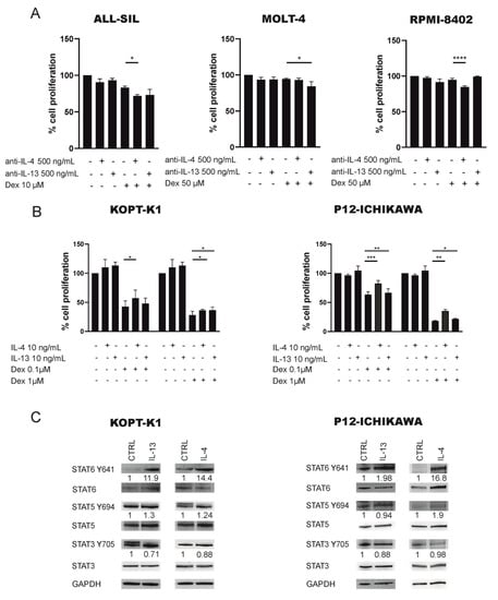 ALL-SIL, MOLT-4 and RPMI-8402 cell lines were pre-treated with anti-IL-4 (#11964; Cell Signaling Technologies, Danvers, MA, USA) or anti-IL-13 human neutralizing antibody (Invivogen, San Diego, CA, USA) 500 ng/mL overnight and then treated with DMSO or dexamethasone (Sigma-Aldrich, St. Louis, MO, USA). Cell proliferation was assessed by (4,5-dimethylthiazol-2-yl) -2,5-diphenyltetrazolium bromide (MTT) test after 72 h. KOPT-K1 and P12-ICHIKAWA cell lines were pre-treated with IL-4 (10 ng/mL, CellS GFH9) or IL-13 (10 ng/mL, CellS GFH85) overnight followed by DMSO or dexamethasone (1–0.1 µM) treatment. Cell proliferation was assessed by MTT after 72 h. ALL-SIL and MOLT-4 were treated with the STAT6 specific inhibitor, AS1517499 alone or in combination with dexamethasone for 48 h. Control cells were treated with DMSO only. Cell proliferation was assessed by MTT. ALL-SIL, MOLT-4 and RPMI-8402 were also treated with ruxolitinib alone or in combination with dexamethasone for 72 h. Control cells were treated with DMSO only. Cell proliferation and viability were assessed by MTT and apoptotic assay (Annexin V/PI), respectively. Primary cells were treated with ruxolitinib and dexamethasone alone or in combination for 48 h and cell viability was evaluated by apoptotic tests (Annexin V/PI). Primary cells were cultured in minimum essential medium α (MEM α; Gibco) with 10% FBS, 10% human serum (Gibco), penicillin (100 U/mL; Gibco), human IL-7 (10 ng/mL; Peprotech, London, UK), human SCF (50 ng/mL; Peprotech), human FLT3- ligand (20 ng/mL; Peprotech), and insulin (20 nM; Sigma-Aldrich). After thawing, the cell viability of primary cells used for Annexin V/PI test, after in vitro treatment with dexamethasone and ruxolitinib, was evaluated by Trypan blue cell count and only samples with a viability >70% were considered.