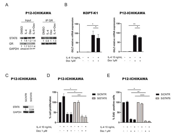 It has been previously described that in normal T cell lymphocytes the transcriptional activity of the GR can be inhibited by STAT6 [23] binding. We thus wondered whether this mechanism could contribute to dexamethasone resistance also in our model. As first, to verify whether STAT6 and GR physically interact, we performed an immunoprecipitation for GR protein in P12-ICHIKAWA cell line (Figure 3A, Figures S4 and S6) after treatment with IL-4 and dexamethasone alone or in combination, and we evaluated the binding of STAT6. Interestingly, we observed that after stimulation with IL-4 or treatment with dexamethasone there is no increase in STAT6 binding to GR. Conversely, in the combined treatment with IL-4 and dexamethasone there is more STAT6 protein bound to GR compared to untreated or dexamethasone only treated cells, thus supporting our idea that in the presence of IL-4 and dexamethasone, STAT6 can bind to GR and inhibits its activity. To verify this latter hypothesis, we evaluated GR transcriptional activity by measuring GILZ mRNA expression, a well-known GR target gene [24], in P12-ICHIKAWA and KOPT-K1 cells after IL-4 or dexamethasone treatment alone or in combination. Interestingly, we observed that after dexamethasone treatment GILZ mRNA levels increased both in P12-ICHIKAWA and KOPT-K1 cell lines, whereas GILZ expression significantly decreased if cells were pretreated with IL-4 before dexamethasone treatment (Figure 3B), thus also explaining the decreased response to dexamethasone treatment in IL-4 or IL-13 pretreated GC sensitive cell lines (Figure 2B). To finally demonstrate that this mechanism is STAT6 mediated, we performed specific STAT6 gene silencing in P12-ICHIKAWA cells (Figure 3C and Figure S6) followed by 48 h treatment with dexamethasone combined or not with a 16 h IL-4 pre-treatment. Of note, both P12-ICHIKAWA SiSTAT6 cells treated with dexamethasone alone or pre-treated with IL-4 followed by 48 h of dexamethasone treatment showed an increased response to GC compared to SiCNTR cells cultured at the same experimental conditions (Figure 3D,E, third and fourth gray bar). We did not observe an increased GC resistance in SiCNTR cells pre-stimulated with IL-4 followed by dexamethasone treatment, different to what observed in Figure 2B, probably due to the stress induced by the electroporation process.