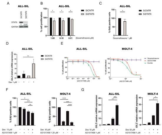 To further demonstrate the pivotal role of STAT6 in contributing to GC resistance, we performed both STAT6 specific gene silencing and pharmacological inhibition with the AS1517499 inhibitor, which selectively inhibits STAT6 [25], in GC resistant cell lines alone or in combination with dexamethasone. As expected, in ALL-SIL cell line in which the expression of STAT6 was knocked down (Figure 4A and Figure S6), we observed a significant cell proliferation decrease after 48 h of dexamethasone treatment at 1–0.01 μM compared to control measured both by MTT assay and EdU staining (Figure 4B,C). Moreover, the knock-down of STAT6 in ALL-SIL followed by dexamethasone treatment led to a significantly augmented GR activity, measured by GILZ expression, compared to control (Figure 4D). Similarly, when we treated GC resistant ALL-SIL and MOLT-4 cell lines with the AS1517499 STAT6 inhibitor, alone or in combination with dexamethasone, we observed that cell proliferation, measured by MTT assay and EdU staining, was significantly reduced by the combined treatments in both cell lines (Figure 4E,F). Conversely, the GR activity, as measured by GILZ expression, was significantly increased in the combined treatment compared to dexamethasone or AS1517499 alone (Figure 4G). The ability of AS1517499 to inhibit STAT6 Y641 phosphorylation was confirmed by WB (Figures S5A and S6) as well as its synergistic activity with dexamethasone, demonstrated by CI values always <1 (Table S5A). Overall, these results clearly show that STAT6 hyperactivation markedly contributes to therapy resistance by binding the glucocorticoid receptor and inhibiting its transcriptional activity.