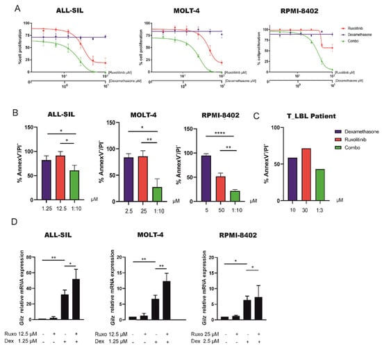 Pharmacological inhibition of JAK1/2 kinases decreases cell proliferation and increases dexamethasone induced cell death in GC resistant leukemia cells. (A) ALL-SIL, MOLT-4, and RPMI-8402 cells treated with dexamethasone and ruxolitinib alone or in combination. All the three cell lines were treated at the molar ratio (ruxolitinib: dex) of 10:1 and cell proliferation was determined by MTT test after 72 h of treatment (n = 3 at least for all experiments). Results are presented as means ± SEM. (B) Cell mortality was determined by flow cytometry and annexin V/PI staining after 72 h of treatment. The percentage of dead cells was established after normalizing cells on DMSO-treated cells. (Paired t test; n = 3 for all experiments). Results are presented as means ± SEM. Dexamethasone and ruxolitinib concentrations used in these experiments were selected based on MTT test results. (C) Primary cells isolated from one T-LBL patients were treated with dexamethasone (10 μM) and ruxolitinib (30 μM) alone or in combination for 48 h. Cell mortality was determined by flow cytometry and annexin V/PI staining. The percentage of dead cells was established after normalizing cells on DMSO treated cells. (D) GR transcriptional activity measured by GILZ mRNA levels in ALL-SIL, MOLT-4 and RPMI-8402 cells treated with DMSO, dexamethasone (ALL-SIL and MOLT-4 1.25 μM; RPMI-8402 2.5 μM) or ruxolitinib (ALL-SIL and MOLT-4 12.5 μM; RPMI-8402 25 μM) alone or in combination. Results are presented as means ± SEM (* p < 0.05; ** p < 0.01; **** p < 0.0001. paired t test).