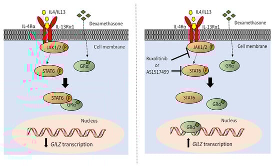 Schematic representation of the JAK1/2-STAT6 pathway and its interaction with GR protein. On the left, the kinases JAK1/2, once activated by the binding of IL-4 or IL-13 to their receptors, can phosphorylate STAT6 in Y641, which in turn sequestrates GR that cannot transcribe its pro-apoptotic genes making these cells more resistant to dexamethasone treatment. On the right the inhibition of JAK1/2 or STAT6 Y641 phosphorylation by ruxolitinib or AS1517499, respectively, allows the GR to bind to the DNA, thus promoting the transcription of its target genes, such as GILZ, making these cells more sensitive to dexamethasone treatment.