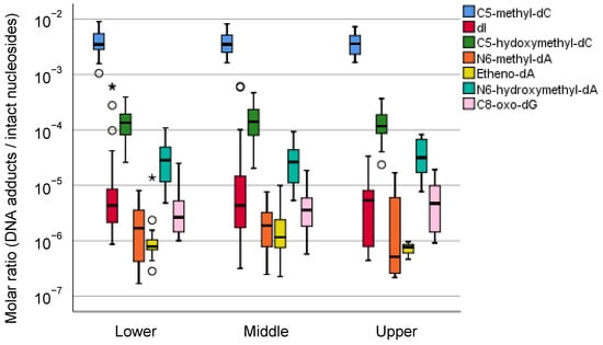 Distribution of DNA adduct profiles in the upper, middle, and lower parts of the gastric mucosae of gastric cancer patients. The molar ratio data of DNA adducts were retrieved from our previously published research [57]. The center line of the box indicates the median, and the top and bottom edges of the box indicate their interquartile ranges (IQR). The whiskers show the maximum or minimum values within a range of 1.5 times the IQR from the edge of the box. Outliers are indicated by circles (°) that are 1.5 to 3 times the IQR from the top or the bottom of a box and by stars (*) that are more than 3 times the IQR from the top or the bottom of a box.