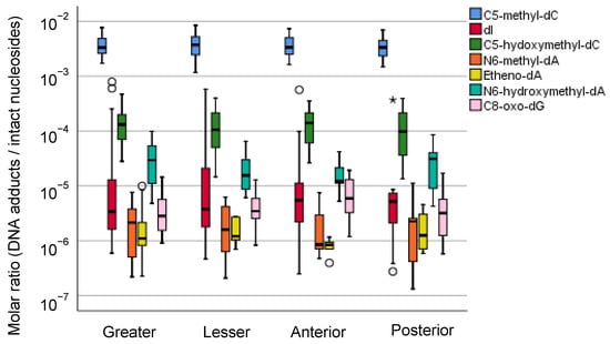 Distribution of DNA adduct profiles in the greater curvature, lesser curvature, anterior wall, and posterior wall of the gastric mucosae of gastric cancer patients. The molar ratio data of DNA adducts were retrieved from our previously published research [57]. The center line of the box indicates the median, and the top and bottom edges of the box indicate their interquartile ranges (IQR). The whiskers show the maximum or minimum values within a range of 1.5 times the IQR from the edge of the box. Outliers are indicated by circles (°) that are 1.5 to 3 times the IQR from the top or the bottom of a box and by stars (*) that are more than 3 times the IQR from the top or the bottom of a box.