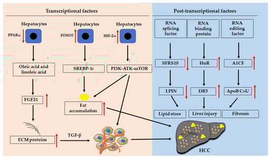 Transcriptional and post-transcriptional factors mediated the progression of NAFLD and HCC. Abbreviations: AKT: protein kinase B; ApoB: apolipoprotein B; A1CF: catalytic polypeptide 1 complementation factor; DR5: death receptor 5; FOXO: Forkhead box; HIF-2α: hypoxia-inducible factor-2 alpha; HuR: human antigen R; LPIN: lipin; mTOR: mechanistic target of rapamycin; PI3K: phosphoinositide 3-kinase; PPARs: peroxisome prolifera-tor-activated receptors; SFR10: splicing factor, arginine/serine-rich 10; SREBP-1: sterol regulatory element-binding transcription factor-1; TGF-β: transforming growth factor-beta.