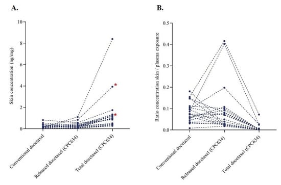 Docetaxel pharmacokinetics in the skin. (A) Docetaxel concentration in the skin after conventional docetaxel and CPC634 (released and total) administration (n = 20). (B) Docetaxel concentration ratio in the skin relative to plasma docetaxel concentration. * In these patients, skin biopsies were taken on day 15 of both cycles (n = 2).