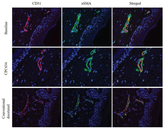 CD31 and aSMA staining of the skin biopsies at baseline, after administration of CPC634 and conventional docetaxel.