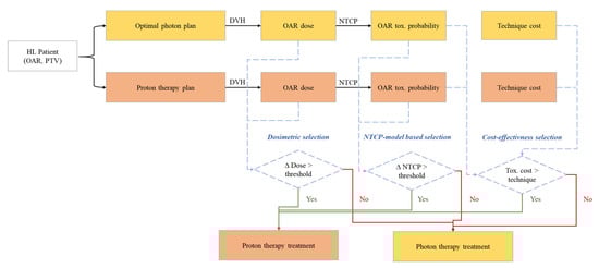 Dosimetric superiority does not necessarily translate into clinical benefit; consequently, NTCP models have been used to predict expected radiation-induced toxicity reduction to ultimately select patients who may benefit the most from proton therapy. Langendjik et al. [21] proposed a stepwise methodology for patient selection for protons based on an in-silico comparison between toxicity predicted by NTCP models with proton therapy and optimal photon radiotherapy; such comparative approach has recently been accepted by the Dutch health authorities to allow proton therapy reimbursement. It should be stressed that this NTCP model-based method only applies when the primary goal of proton therapy is to reduce toxicity, which is effectively the case for HL. Optimal VMAT and IMPT plans are simultaneously generated for each evaluated patient. The absolute dosimetric differences to each OAR are retrieved and converted into a toxicity reduction probability based on various NTCP models adapted to the corresponding OAR (∆NTCP). When this toxicity reduction probability is greater than a predetermined threshold (which is usually subjective), the patient is accepted for proton therapy treatment. This selection method has recently demonstrated its feasibility for head and neck cancer patients in the Netherlands [22].