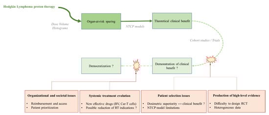 Hodgkin lymphoma (HL) is characterized by a high curative rate, evaluated between 80% and 90% [1]. Consolidative radiation therapy is currently the gold standard for early-stage HL since it is associated with improved progression-free survival [2]. However, first-generation radiation therapy techniques, using large extended fields, increased cardiac and pulmonary morbidity as well as secondary cancers for mediastinal HL irradiation [3]. Fortunately, technical progress was subsequently made to better spare organs-at-risks (OAR) without altering the local tumor control or patient, such as the development of intensity-modulated radiation therapy (IMRT) with smaller target volumes [4] or respiratory control techniques [5]. Due to the physical characteristic of proton beams to deliver most of their energy at the end of their trajectory, proton therapy has been evaluated for mediastinal HL irradiation to spare OARs [6]. It has been demonstrated that proton therapy could spare OAR significantly better than other static or rotational IMRT techniques [7], which may translate into fewer late cardiac, pulmonary, esophageal, and thyroid late toxicities. In some cases, this reduction may also lead to a reduction in the secondary cancer risk [8], even if, according to current models, the risk related to fractionated low doses has been recently reevaluated [9,10]. Proton therapy is consequently a promising technique for selected patients who may benefit from maximal OAR sparing, such as young female patients or patients with cardiovascular comorbidities. However, while proton therapy for HL is promising to limit late toxicity, its implementation in clinical practice is facing multiple issues. Prioritization methods for patient selection are subject to debate, considering the current particle beam therapy facility shortage and the societal and operational cost of proton therapy compared with lower-cost classic radiotherapy [11]. Further, management of HL has recently been rapidly changing with the evaluation of new, highly therapeutic systemic drugs (such as brentuximab vedotin and anti-CD30 car-T cells [12,13]). The purpose of this review is to identify and discuss controversies and challenges for the larger implementation of this promising technique in the near future.