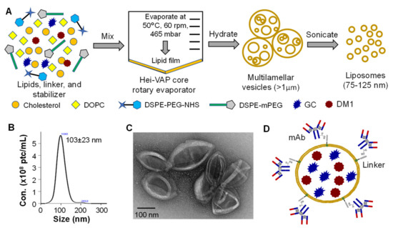 The 10 µmol of DOPC and 3.33 µmol of cholesterol (molar ratio = 3:1) were mixed in a round-bottom flask which contains 10 mL of chloroform. Then 0.8 µmol of DSPE-PEG-NHS linker, 0.67 µmol of DSPE-mPEG, 5 mg of GC, and 1 mg of DM1 were added into the mixture. To form a thin lipid film, the chloroform was evaporated by a rotary evaporator at 50 °C and 60 rpm for 1 hr. The gaseous chloroform residue was removed by vacuum pump. Then, the lipid was hydrated into 10 mL of phosphate buffered saline (PBS), followed by horizontal shaking at 37 °C and 120 rpm for 1 hr. The hydrated liposomes were sonicated in an ultrasonic bath (Fisher Scientific, Pittsburgh, PA, USA) for 15 min to reduce particle size. Then 6.67 nmol (1 mg) of anti-EGFR mAb was mixed with liposomes, followed by 2-h incubation at 40 °C. The packed drugs were titrated using HPLC (Shimadzu, Columbia, MD, USA) equipped with Shimadzu Nexcol C18 column (5 µm, 50 × 3.0 mm) with elution buffer of 55:45 methanol and water with flow rate of 0.65 mL/min at 25 °C.