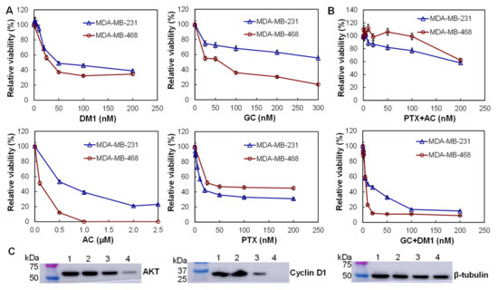 The MDA-MB-231 and MDA-MB-468 cells were seeded into 96-well plates with viable cell density of 1 × 105 cells/mL and viability of >95%. At 4 h post-seeding, the solution of free drugs (mertansine, gemcitabine, paclitaxel, or doxorubicin) was added to cells to reach a series of final concentration of 200, 100, 50, 20, 10, 5, 2, 1, 0 nM (DM1, GC, PTX, DM1 + GC, PTX + AC) and 0–1.5 µM (AC). At 5 days post-treatment, the viable cells were measured by Luminescent Cell Viability Assay (Promega, Madison, WI, USA). The relative viability was calculated as (viable cells in treatment group/control group) × 100%.