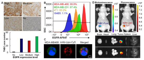 The EGFR, which stimulates the cancer proliferation via PI3K/RAS signaling, the repair of DNA damage and metastasis [19,20,21,22,23], is overexpressed in various tumors, e.g., TNBC (52–54%) [24,25], lung cancer (40%) [26,27], glioblastoma (50%), head and neck cancer (80–90%) [24,25,28], ovarian, cervical, bladder, gastric, endometrial and colorectal cancers [29]. EGFR is more predominant in TNBCs than other breast cancers [24,30], and usually correlates with tumor invasion and poor prognosis. From this perspective, anti-EGFR mAb was utilized in this study as a ligand to target TNBC. The targeted liposomal drug formulation is expected to prolong the circulation half-life and enhance the maximum tolerated dose.