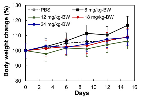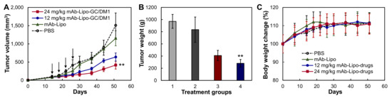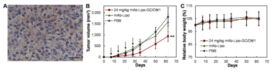 To investigate the tolerated dosage of mAb-Lipo-drugs, the non-tumor bearing BALB/cJ mice were treated with EGFR mAb-Lipo-GC/DM1 at dosages of 0, 6, 12, 18 and 24 mg/kg via i.v. injection. No obvious changes in water intake, breathing and locomotion, body weight, or overall survival were observed for two weeks after injection. The changes of body weight were in the range of 6.4–11.8% for all the groups (Figure 4). Two dosages, i.e., 12 and 24 mg/kg, were used in the in vivo anti-tumor efficacy study.