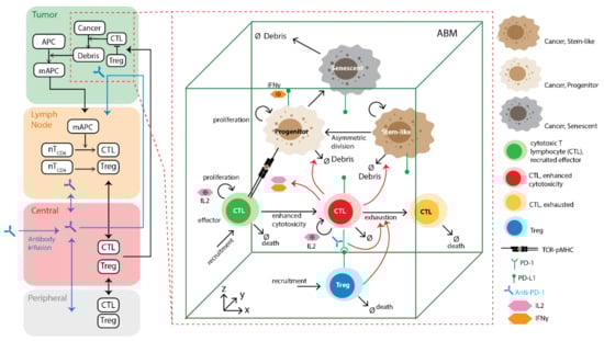 - Gong, C.; Milberg, O.; Wang, B.; Vicini, P.; Narwal, R.; Roskos, L.; Popel, A.S. A Computational Multiscale Agent-Based Model for Simulating Spatio-Temporal Tumour Immune Response to PD1 and PDL1 Inhibition. J. R. Soc. Interface 2017, 14, 20170320. [Google Scholar] [CrossRef] [PubMed]