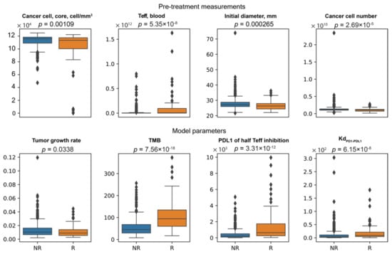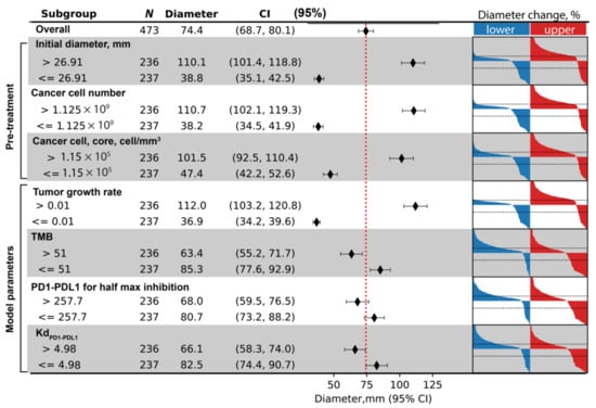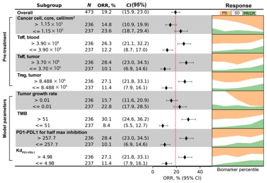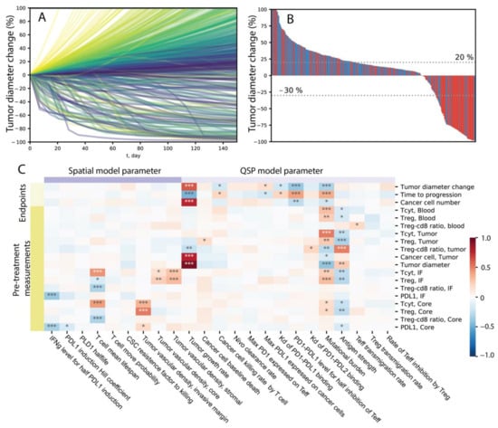 We use RECIST 1.1 criteria to determine whether or not a simulation result indicates the tumor is responsive to treatment. Using calculated tumor diameter, we assign complete response (CR, if tumor cell number drops to below detection threshold), partial response (PR, when at least 30% shrinkage occurs after treatment), progressive disease (PD: more than 20% increase in tumor diameter), or stable disease (SD, between −30% and 20% tumor diameter change). In this study, CR and PR patients are categorized as responsive cases whereas PD and SD are considered not responsive.