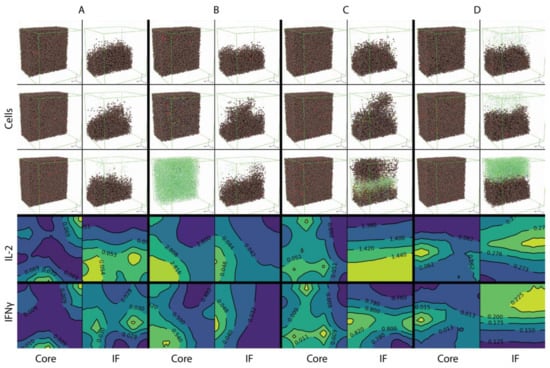 Many studies show that the region near the tumor boundary, referred to as invasive front or invasive margin, plays a very important role in tumor growth and immune response [36,38,61,62]. Thus, we represent this region separately from regions in the core of the tumor. We use two separate ABM modules to represent tissues at the invasive front and core of a tumor, respectively. The two modules represent two types of ROI which differ from each other in two ways: the initial conditions to populate the volume with cells, including cancer cells and lymphocytes, and whether we allow the ROI window to shift perpendicular to the tumor surface to track a moving invasive front. For the tumor core module, all voxels are populated with cancer cells with the same probability, and window shifting is disabled. For the invasive front module, only voxels with z values smaller than half of the height simulated ROI are populated with cancer cells with the same probability as in the core module—the z-axis here is arbitrarily chosen as the normal (perpendicular) to the tumor surface. During the simulation, the center of mass of cancer cells in the invasive front module is kept the same. If a deviation occurs, we shift the window by moving all content, including all cellular and molecular concentrations in the opposite direction so that the center of mass of cancer cells remains at the same location within the window. As a result, when the tumor grows or shrinks during a simulation, the window tracks the edge of the tumor as it moves. During initialization, entry points for T cell recruitment representing tumor vasculature are randomly created. The density of these entry points can be chosen depending on relative vascular density in different regions of a tumor; experimental data on tumor vasculature can be used to guide this process [63,64,65].