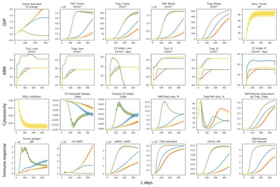 In order to properly account for the patient-scale multi-organ system response to anti-tumor immune checkpoint therapy and the tissue–cellular scale heterogeneity, hybrid models are desirable in that they can potentially take advantage of the strengths of both QSP and ABM models [45]. Hybrid models integrating ABM simulation with ODE-based models have already been used in other studies in the context of tumor development and drug testing. In addition to ABM simulations, these models use differential equations to recapitulate sub-cellular dynamics of signal transduction [46,47] or transport of anti-tumor drugs [48]. Software packages have been created to facilitate development of hybrid models involving ABM for human disease studies, especially cancers. These packages, such as PhysiCell [49], CompuCell [50] and Hybrid Automata Library (HAL) [51], integrate ABM simulation of the tissue-scale multicellular system with PDE/ODE solvers to handle chemical environment and molecular scale sub-cellular interactions. However, so far, these hybrid models have not incorporated a full-fledged QSP model to allow quantitative assessment of the efficacy of pharmaceutical agents against tumor development in the human body.